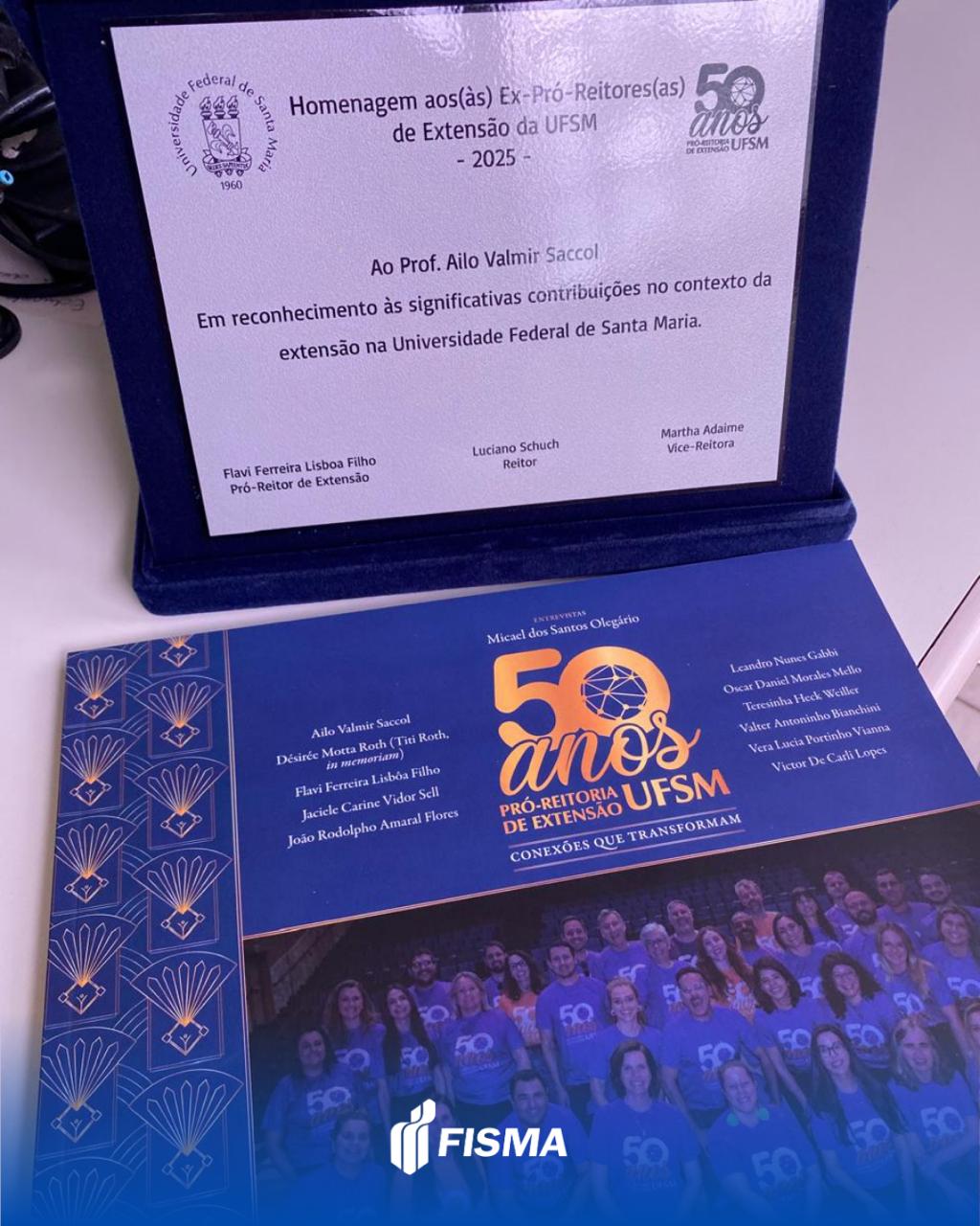 O Diretor Geral da Faculdade Integrada de Santa Maria (FISMA), professor Ailo Saccol, recebeu uma homenagem da Universidade Federal de Santa Maria (UFSM) em reconhecimento às relevantes contribuições prestadas à área de extensão universitária, durante solenidade promovida por esta Universidade, em comemoração aos 50 anos da extensão da UFSM. O evento ocorreu no dia 15 de dezembro de 2025, em Santa Maria, e teve também como objetivo homenagear os ex-Pró-Reitores de Extensão da Universidade.